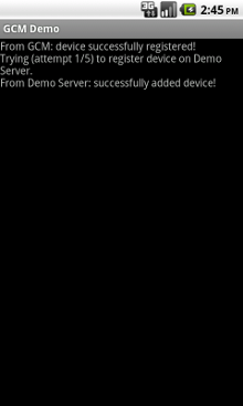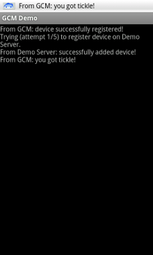 Note: What happened? When you clicked the button, the web server sent a message to GCM addressed to your device (more specifically, to the registration ID returned by GCM during the registration step). The device then received the message and displayed in the main activity; it also issued a system notification so the user would be notified even if the demo application was not running.