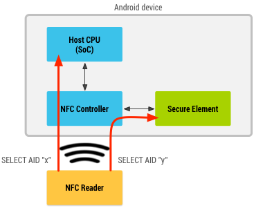 When the user taps a device to an NFC reader, the Android system needs to know which HCE service the NFC reader actually wants to talk to. This is where the ISO/IEC 7816-4 specification comes in: it defines a way to select applications, centered around an Application ID (AID). An AID consists of up to 16 bytes. If you are emulating cards for an existing NFC reader infrastructure, the AIDs that those readers are looking for are typically well-known and publicly registered (for example, the AIDs of payment networks such as Visa and MasterCard).