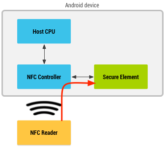 When NFC card emulation is provided using a secure element, the card to be emulated is provisioned into the secure element on the device through an Android application. Then, when the user holds the device over an NFC terminal, the NFC controller in the device routes all data from the reader directly to the secure element. Figure 1 illustrates this concept.