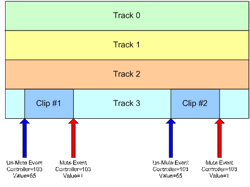 For example, to identify a clip with a clip ID of 1, the author inserts a MIDI controller event with controller=103 and value=65 at the start of the clip and another event with controller=103 and value=1 at the end of the clip. When the JET_TriggerClip() function is called with a clip ID of 1, the track will be un-muted when the controller value 65 is encountered and muted again when the controller value 1 is encountered.