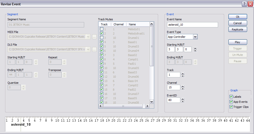 Just below the Event view is the timeline display. The timeline shows how many measures a given segment is as well as any events associated with that segment. The timeline changes to display the currently selected or playing segment. You can trigger an event in this window while the segment is play by simply clicking on the event in the timeline display.