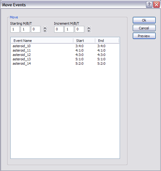 To use Move, first select the segments or events you wish to move in time, then click the Move button. The parameters are as follows: