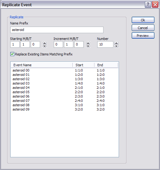 To make adding segments or events faster, use the Replicate command. Replicate can add multiple segments or events at one time and uses an offset parameter and prefix naming convention to keep things easy to read. The MOVE command is also useful for moving multiple events by a set number of measures, beats or ticks.