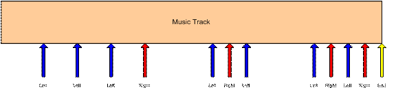 The arrows represent events in the music sequence where game events need to be synchronized. In this case, the blue arrow represents a time where the player is supposed to press the left button, and the red arrow is for the right button. The yellow arrow tells the game engine that the sequence is complete. The player is allowed a certain time window before and after the event to press the appropriate key.