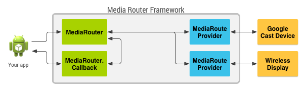 In order to use this framework within your app, you must get an instance of the MediaRouter framework object and attach a MediaRouter.Callback object to listen for events in available media routes. Content channelled through a media route passes through the route's associated MediaRouteProvider (except in a few special cases, such as a Bluetooth output device). The following diagram provides a high-level view of the classes your app can use to play content with the media router framework.