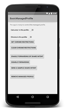 This sample shows how to use app restrictions. This application has one boolean restriction with a key "can_say_hello" that defines whether the only feature of this app (press the button to show "Hello" message) is enabled or disabled. Use AppRestrictionEnforcer sample to toggle the restriction.