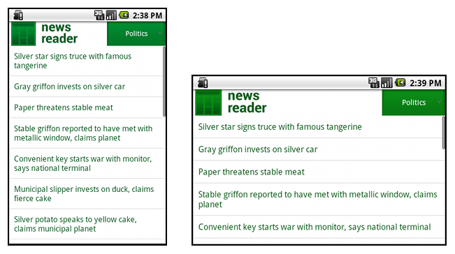 Figure 1. The News Reader sample app in portrait (left) and landscape (right).